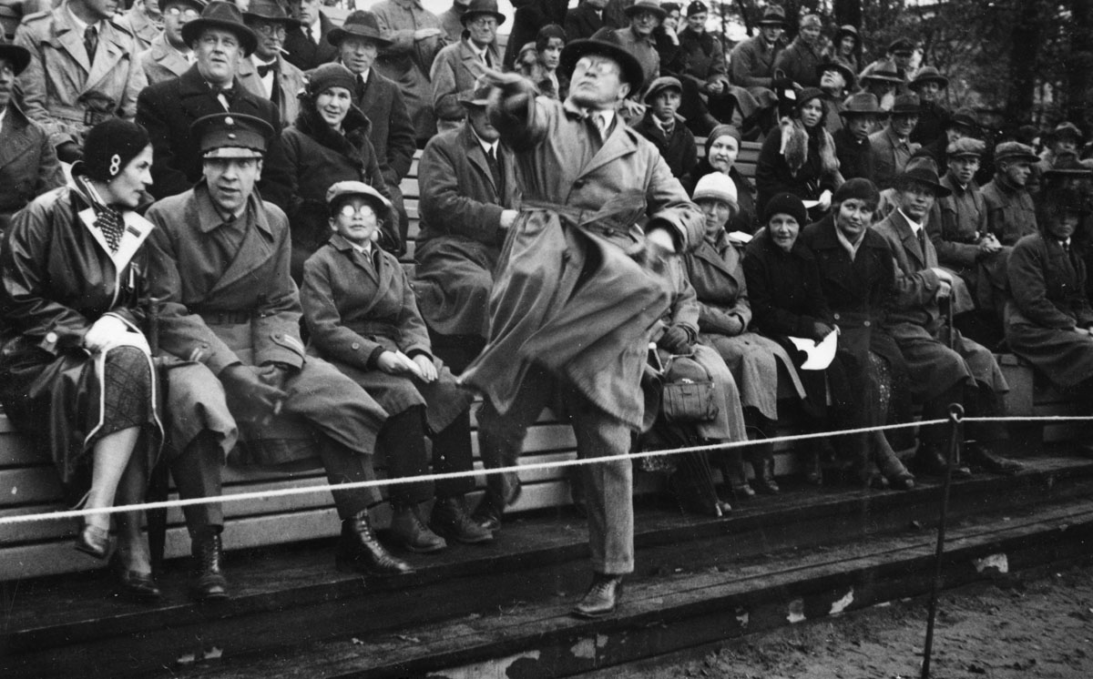 Pihkala heittää avausheiton ensimmäisessä Itä-Länsi – ottelussa 1932.